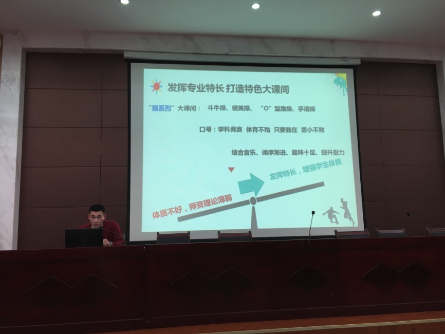 首先,由磐石镇小学傅鑫伟老师带来了《农村学校“操系列”大课间体育活动》专题分享,整套“操系列”由进退场、游戏、准备操、跑操、放松操等各个环节组成,结合不同风格的音乐,遵循循序渐进的运动规律,提高了学生耐力素质。学校在专职体育教师严重缺编的情况下,利用现有资源和场地,在校领导的大力支持和全校师生共同努力下,开展了 “操系列”大课间体育活动。每一个旭日东升的早晨,不仅仅是学校操场回荡着充满活力的音乐,孩子们活力十足的锻炼着更是开启整个校园美好的一天。