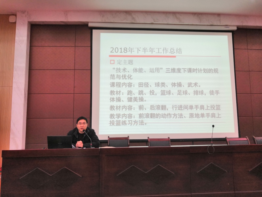 最后,市体育教研员张乐荣老师总结了2018学年第一学期体育教学工作,传达了本学期上级会议精神并布置本学期体育教学工作。张老师从定主题、求整合、聚团队、以赛促学等四个方面作具体总结。他阐明了“技术、体能、运用”三维度下课时计划的规范与优化及一堂体育课的基本要求。统筹整合搭建各种研修班活动、新教师培训、学区教研、送教下乡等活动。上学期在上级各类比赛中我市教师取得非常不俗的成绩,希望各位再接再厉,争取今后更上一个台阶。新学期在新常规形式下更要重视常规和落实常规,努力打造学校特色项目。