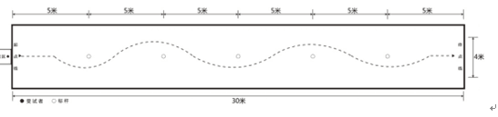 (一)器材场地要求:在平整开阔的硬地上进行,起点宽为2米,终点宽为4米,测试区域长30米,宽10米,起点线至第一标志物的距离5米,共设五个标志物,标志杆高不低于1.2米,各标志物间距5米,标志物距两侧边线5米,考试用球为4号低弹性足球。场地如图所示: