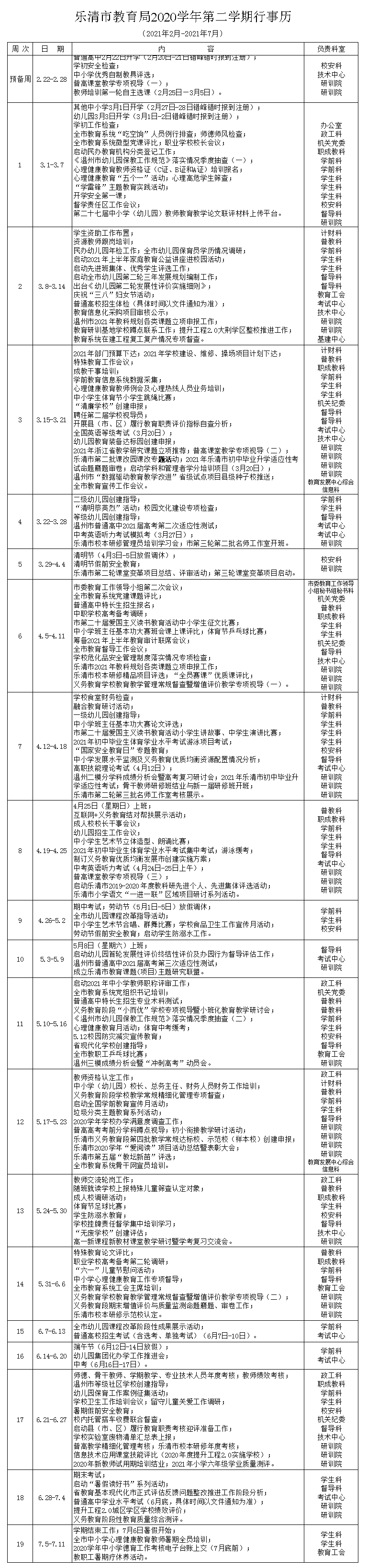 乐清市教育局2020学年第二学期行事历 声明:本站所有文章,如无特殊说明或标注,均为本站原创发布。任何个人或组织,在未征得本站同意时,禁止复制、盗用、采集、发布本站内容到任何网站、书籍等各类媒体平台。如若本站内容侵犯了原著者的合法权益,可联系我们进行处理。